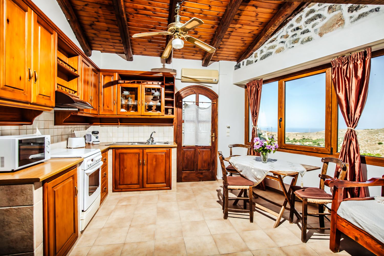 As you know Cretans are very family and community oriented, and this larger house reflects just that, as it was common for friends and family to gather around in the living room and catch up on daily life, making it now the perfect vacation spot for larger families or group of friends. The ground floor has one double bedroom and one smaller bedroom with bunkbeds. The upper floor with external stairs has two bedrooms, two bathrooms and a small veranda with view over the hills and sea.